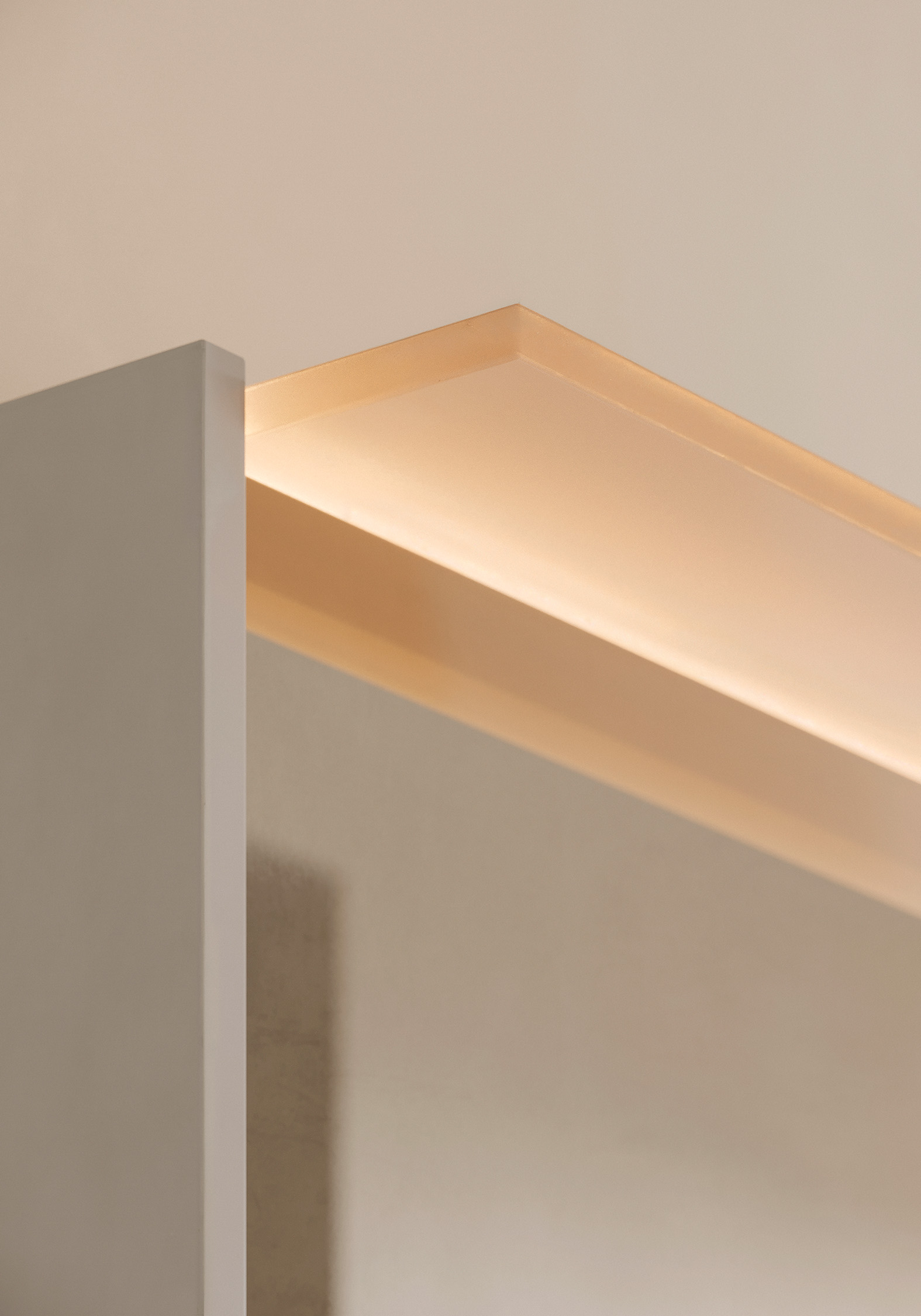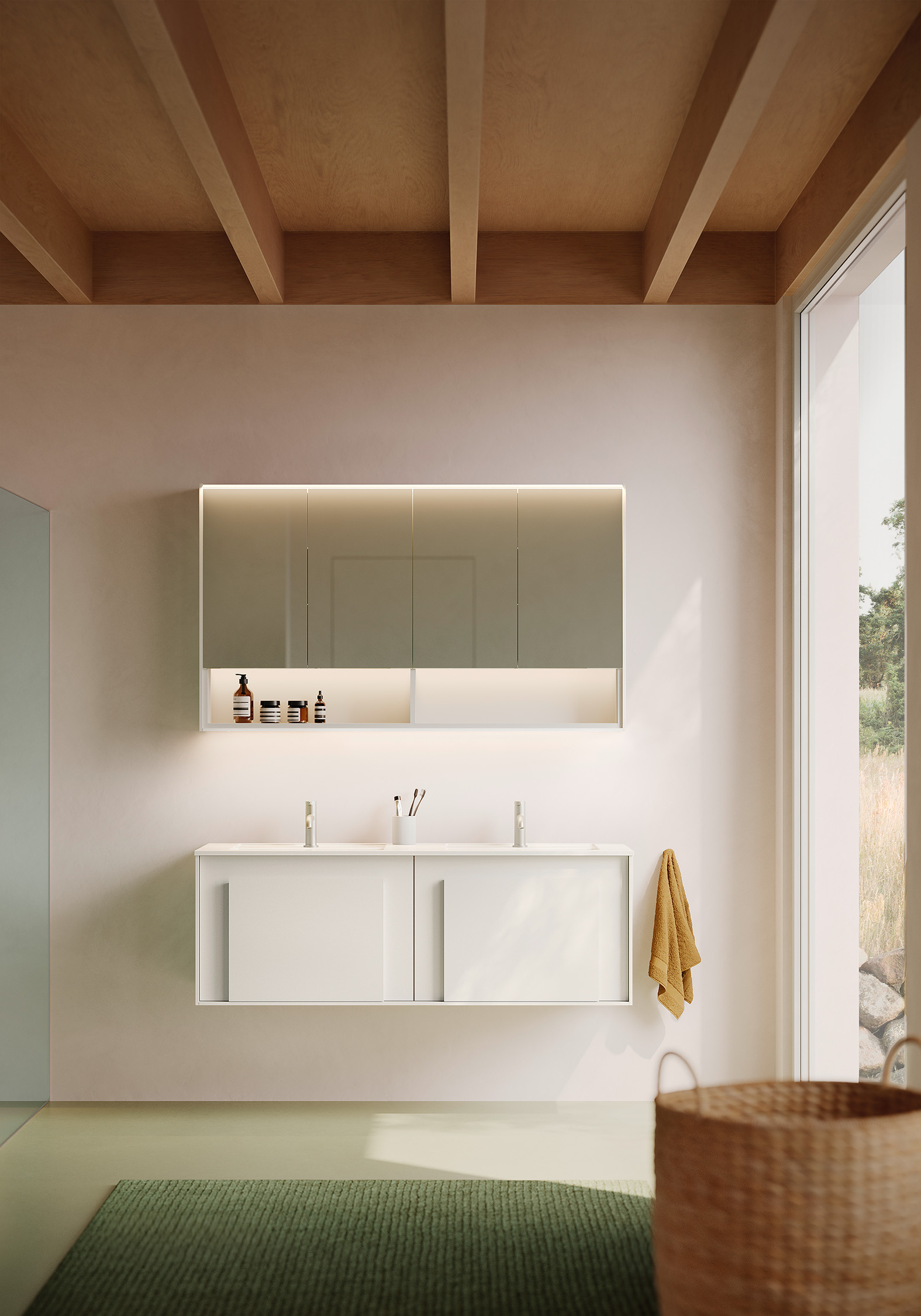 Genauso wichtig für die Farbwirkung von Moto wie der Waschtischunterschrank ist der passend zu allen Waschtisch-Breiten erhältliche, 2- bis 4-türige Spiegelschrank. Denn das bei allen Modellen integrierte offene Fach bietet über die Farbgestaltung der Nische ein zusätzliches Element zur Schaffung individueller Farbklänge. Verstärkt durch eine über die gesamte Fachbreite laufende LED-Beleuchtung können sie eine den ganzen Raum erfassende Atmosphäre entfalten. Erzielt wird dieser Effekt durch eine innenliegende Aufdopplung des weißen Korpus; die so entstehende Nischenauskleidung kann vom Außenkorpus getrennt gewählt werden, sodass der Spiegelschrank innen farbgleich oder in Variation zur Waschtischfront zu gestalten ist. Da auch hier wieder Wunschfarben wählbar sind, eröffnet sich mit dem Spiegelschrank eine schier unendliche Vielfalt an Kombination, um individuelle Farbharmonien oder -kontraste zu kreieren.